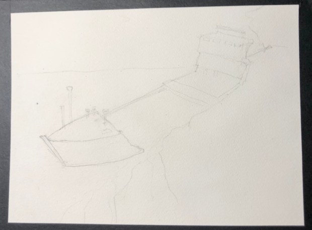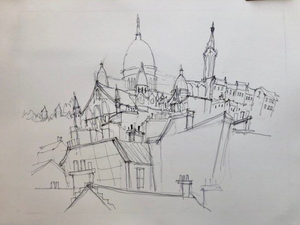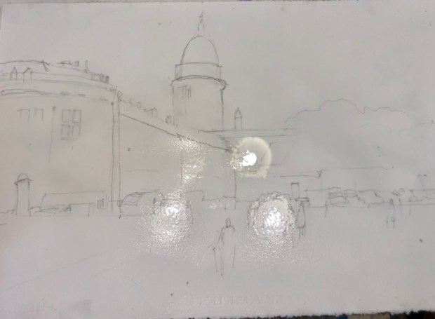 The sketch and my paper sopping wet. We wet both sides and let it sink into the paper. I used a big hake brush to do it.