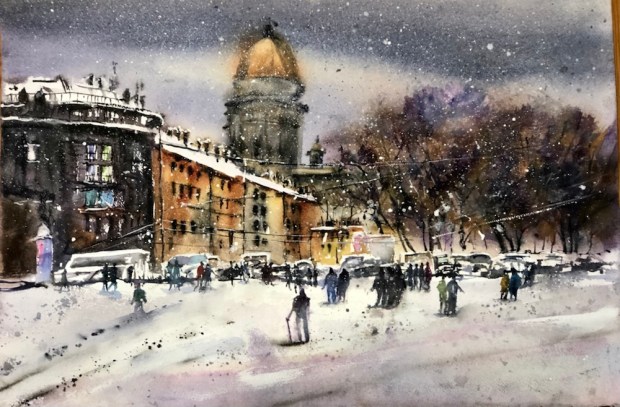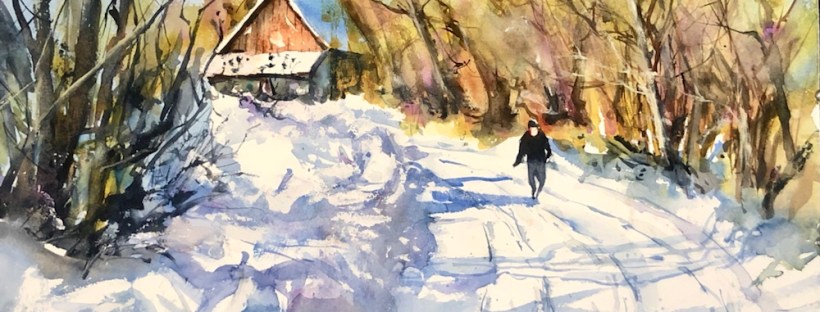 Electric lines done w a liner neutral tint the gouache. The snow spattered w white gouache on a toothbrush. Lots of paint slinging. You should see the tv on my painting Table. Oops.