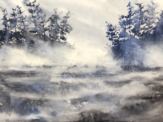 I had no idea how to do the fog which I wanted to do the fog because I live on a river that is frequently heavily fogged. I was following a YouTube video with David R Smith to practice for class tomorrow with my new liner brushes.