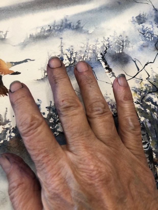 A fun painting to do. I could change several things and betting I will do another one with green fir trees next time.