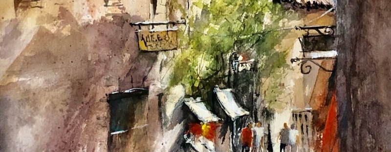 Well now it’s done and I like it. I wiped out a lot of the black by taping and lifting with a Mr Clean and lots of blotting today. Also lost some of the street shadow at the back. Lightened the clothing on the figures. Finished the signs. Added the red which I really like. Messed with the bush. I spent an hour originally painting it. Spent all afternoon fiddling with it. 🤪