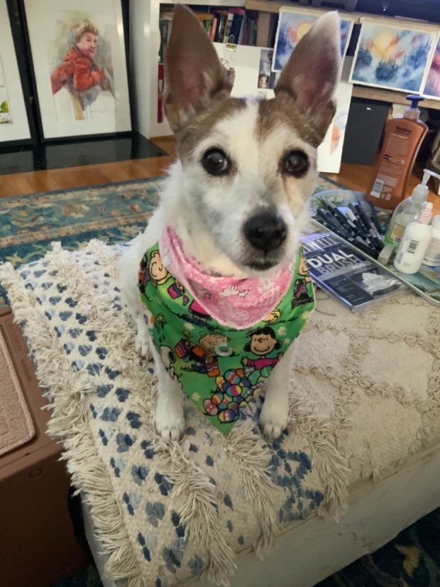 Zoe dressed up for Easter. She likes to start early. The dog seriously loves her scarves. If she shakes them off she will try to nose them back on.
