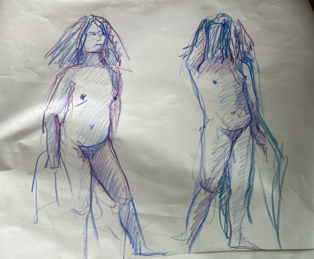 Still not done but it was fun to hang out w friends and paint Azelia who is just lovely and so much fun. Half sheet-15×22” of cold press 140 fluid paper. While I am not fond of a reclining pose had a lot of fun painting the fabric. Used wc paint w very little water to make it opaque. Easy to paint it with the sharp tipped seconds perla brushes. Gesture drawing warm ups. These are two not minutes. Not sure how long ruse were. Five minutes ish. She posed til she got tired of the pose. Five minutes. All done on large sheets of newsprint w Caran d’arche Neocolor ii crayons. What’s for dinner tonite. Meant to cook it yesterday. Oh well. Chicken pot pie. yummm. Plenty left for tomorrow