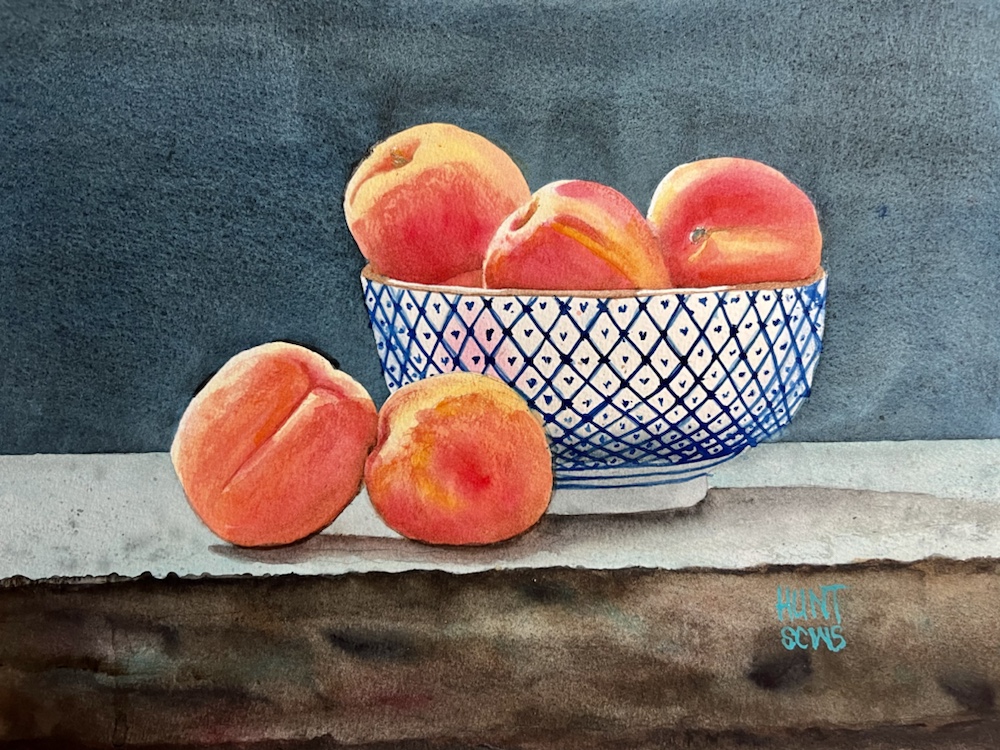 Attempt #3 was best. I kept my lights on most of the apricots. The rock looks good. Background wash might need another layer. Last.