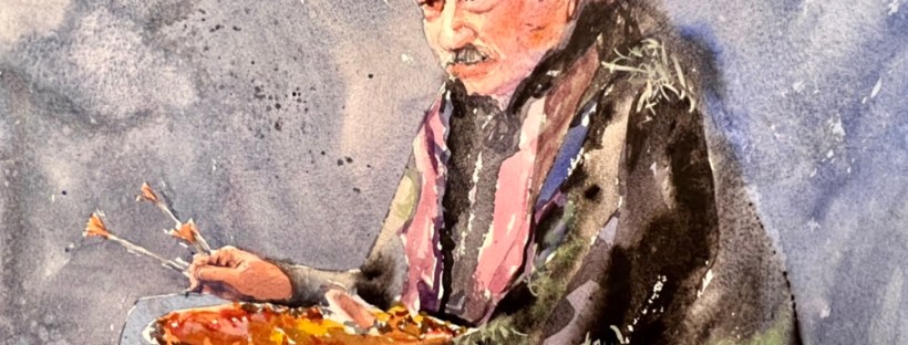 When he popped up on my screen during the paint along he was irresistible to my paint brushes. Been a while since I did drew from “life”. The drawing went well. 1/2 sheet of some or other cold press 140 that was handy. I was drawing fast. The Artist. I think I used my Mary Whyte palette colors. Off to paint another watercolor live class. Only seven left to do. 😳 I thought I had done most of them. 😵💫I really want to paint another flower painting I do like those a lot.