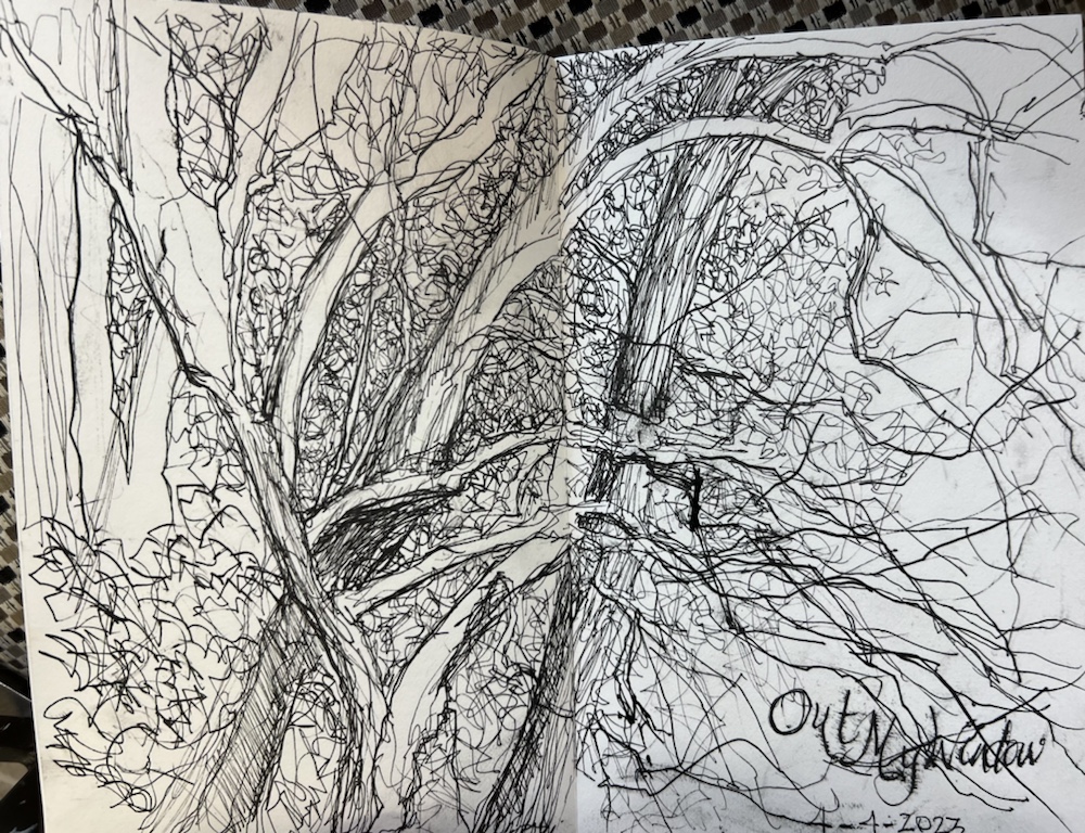 A shot out my windows of the trees i was drawing. Good to sit down after another day of endless cleaning. I even used glass cleaner on my table wiped paint splatters off the studio tv the iPad the brush holders.
