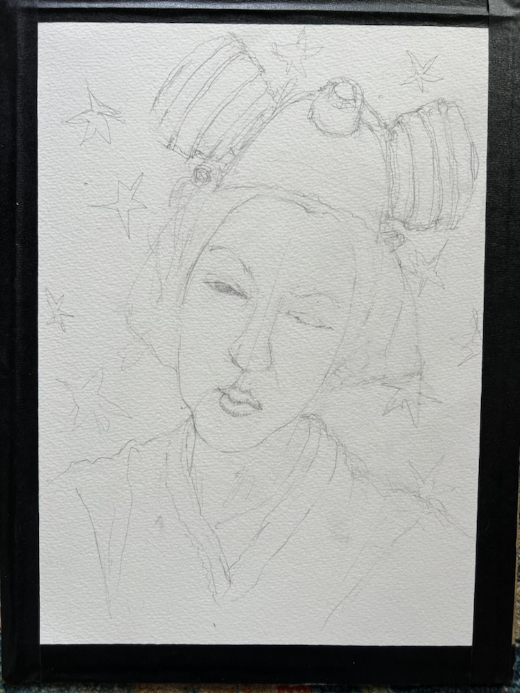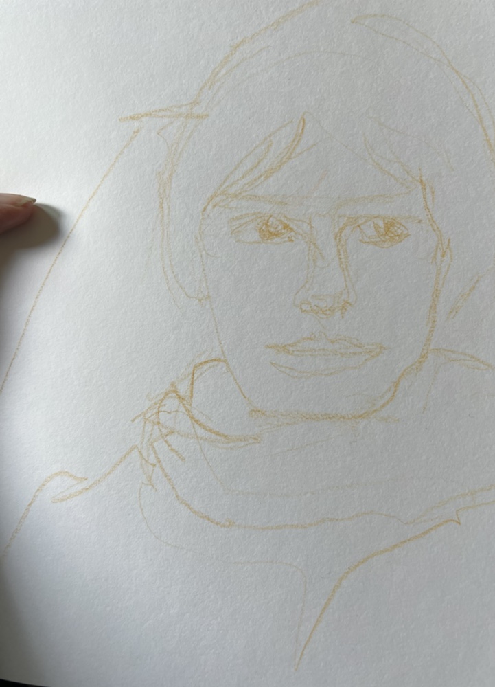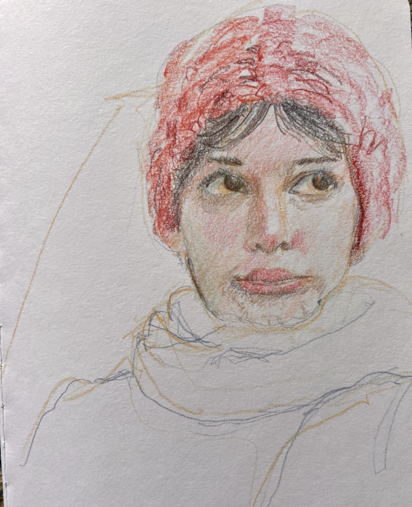 Day 8. #jyportraitchallenge on ig. Loved her w her respirator βhatβ but oh my was Sandra a pain to draw. The sketch. I actually drew her twice. Was going to do this as a watercolor but got a really bad headache and didnβt. Shes still in the ether. Maybe tomorrow. My iphone took this one. Colors are so off. So I took one with my ipad pro. Colors are better. I tried hard to keep the pencil lines so they didnt show but somehow the phone always does even when they dont. π΅π΅π΅The sketchComing along. I almost wish i had stopped here. Love the loose lines of her clothing. Colored pencil and prismacolor artstixs in a Stillman and Birn Alpha.