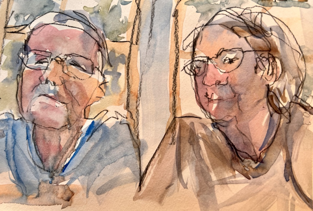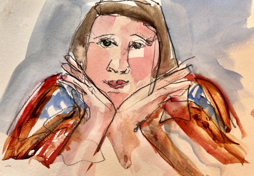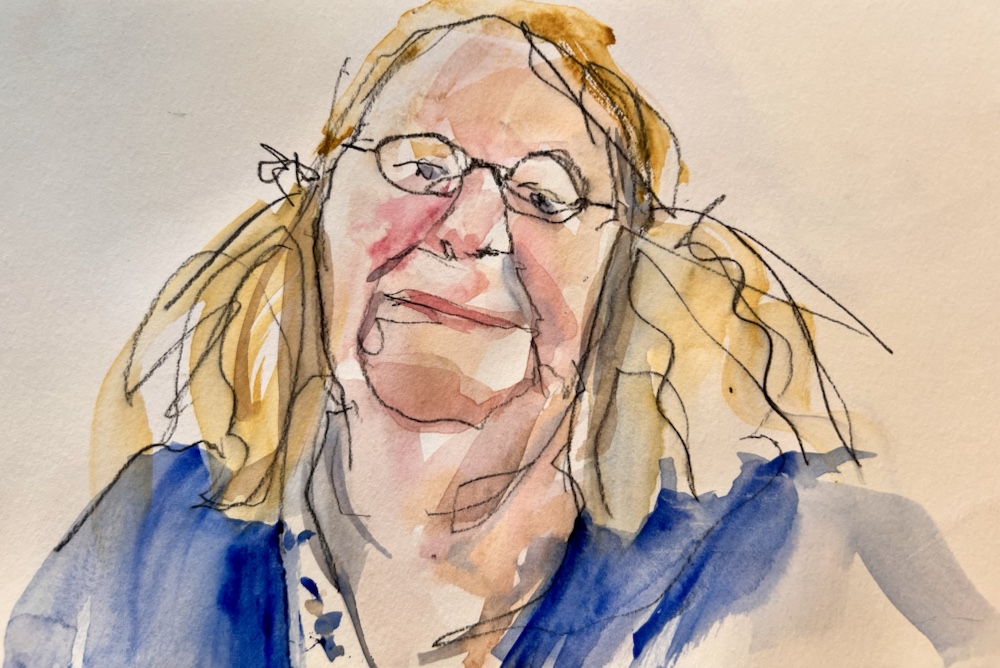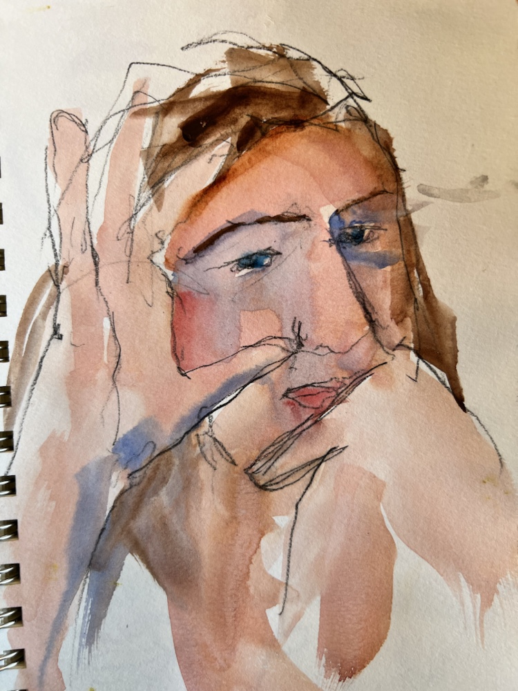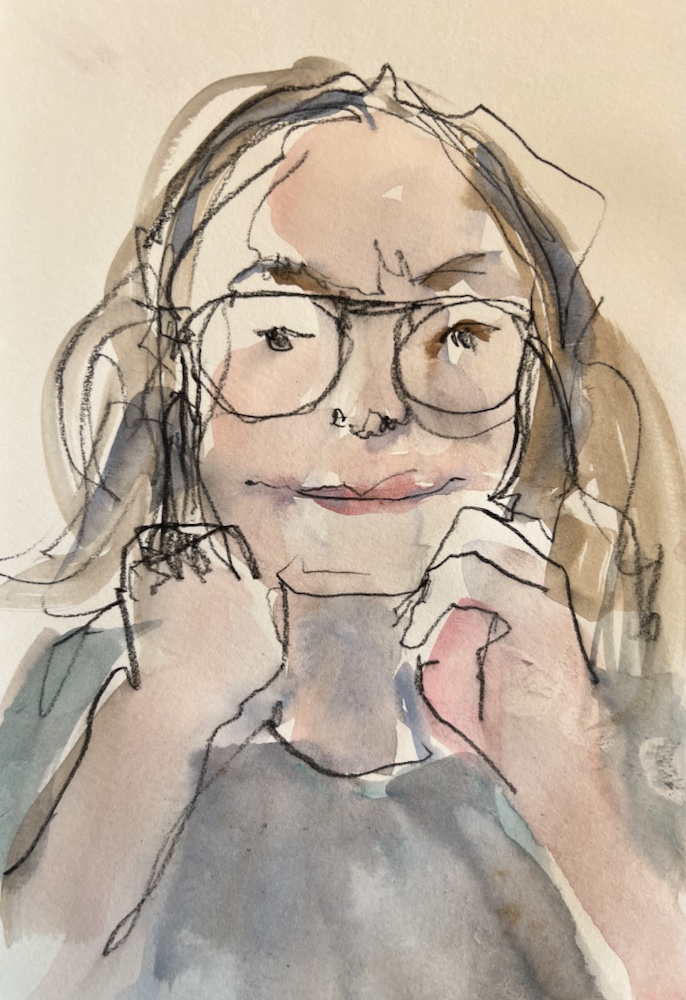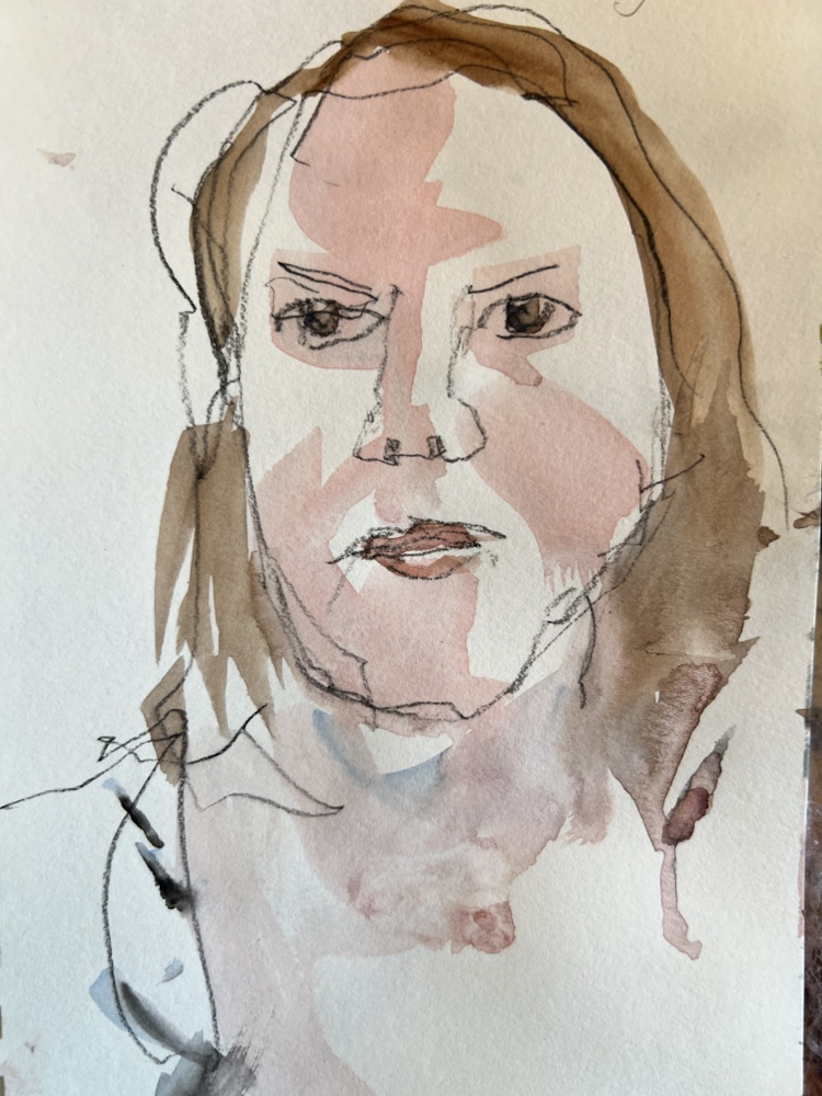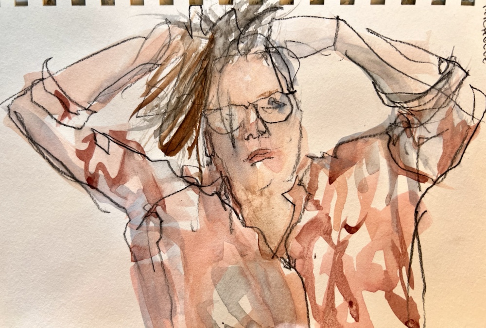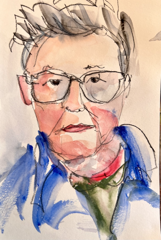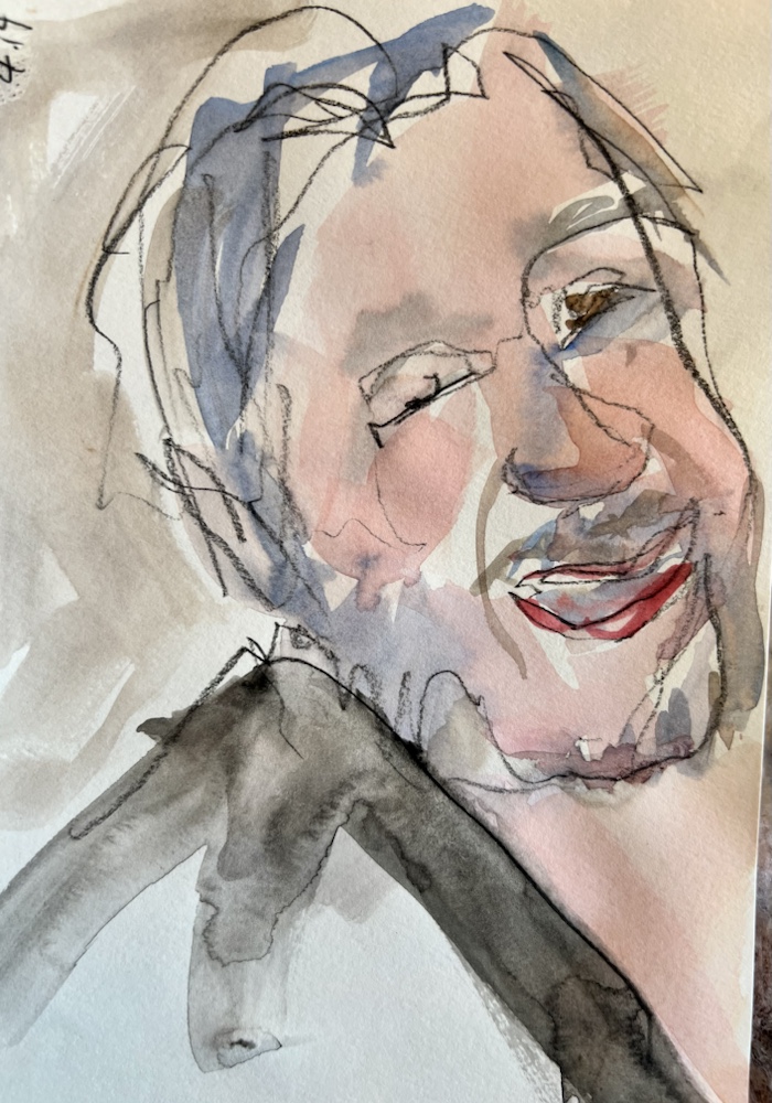 Another fav of mine. Great interesting short hair going grey. Glasses and interest clothes. I was hitting my stride to draw and paint all that in FOUR min.