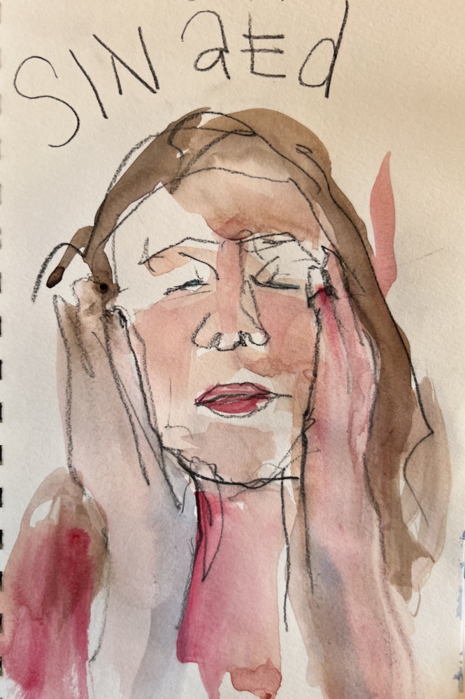 Watercolor splattered on with a 1” flat and 3/8 Saber brush over my cheap general charcoal pencil quin burnt orange, quin rose, manganese and ultramarine, burnt umber