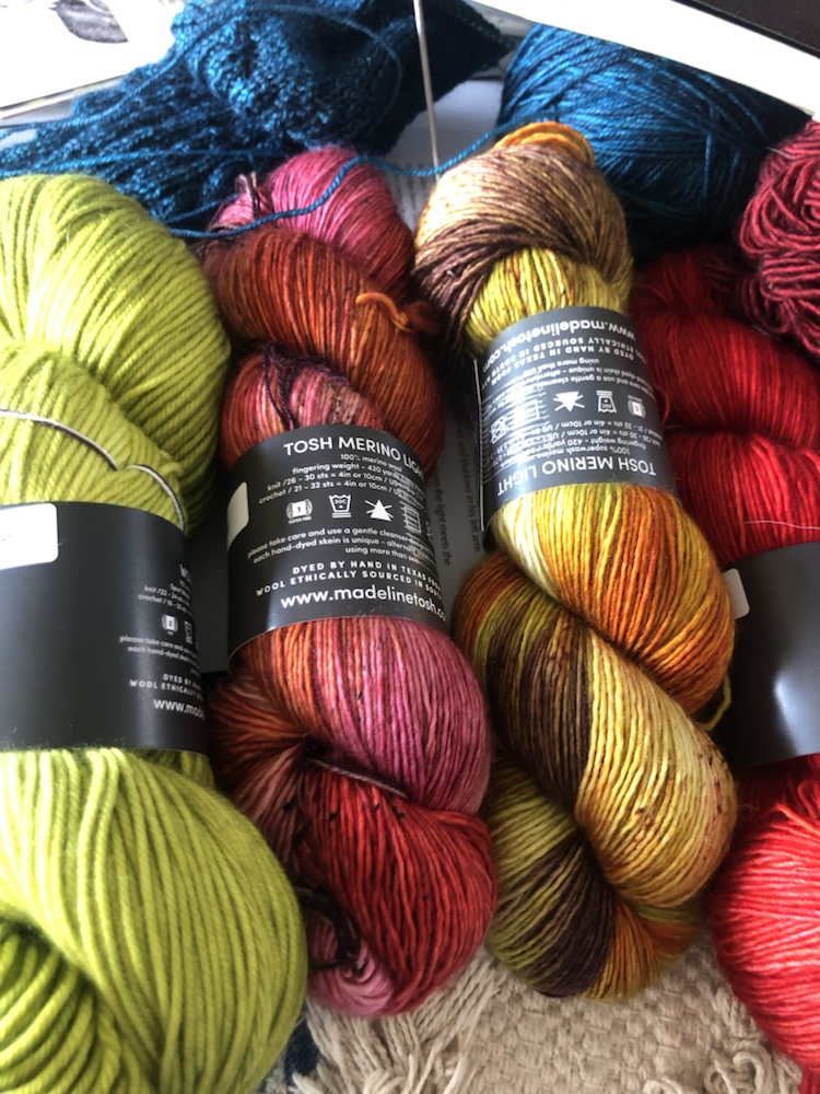 In the meantime. Knitting. Yarn at my feet on the stool.