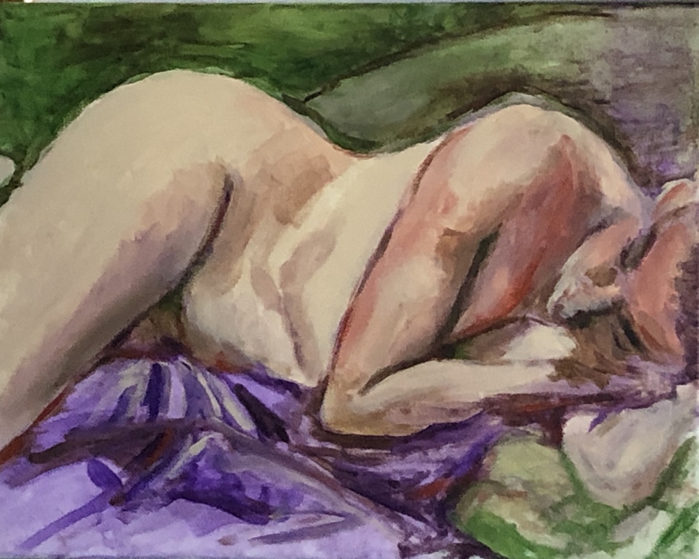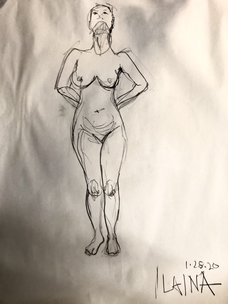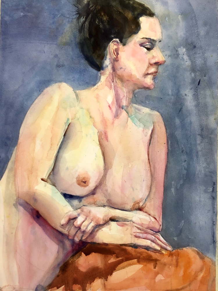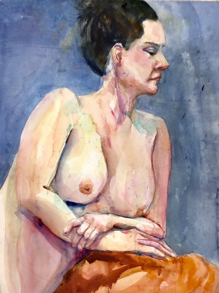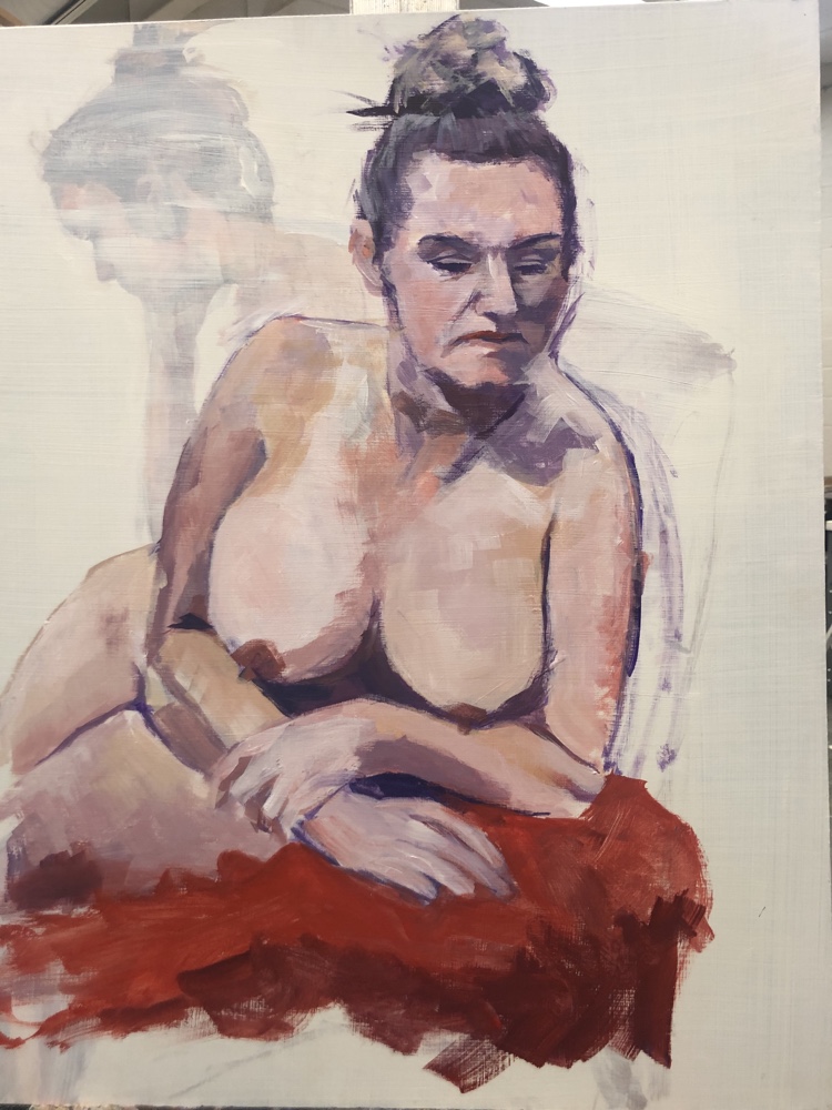 Next break. Or was this when I was done. Not sure. Painted for three 25 min sessions. Since I wasn’t thrilled with the pose I had fun playing and really like all the colors. Lots of alizarin mineral violet Cheap Joes Andrews turquoise. Some cad red and yellow and burnt sienna plus ultramarine.