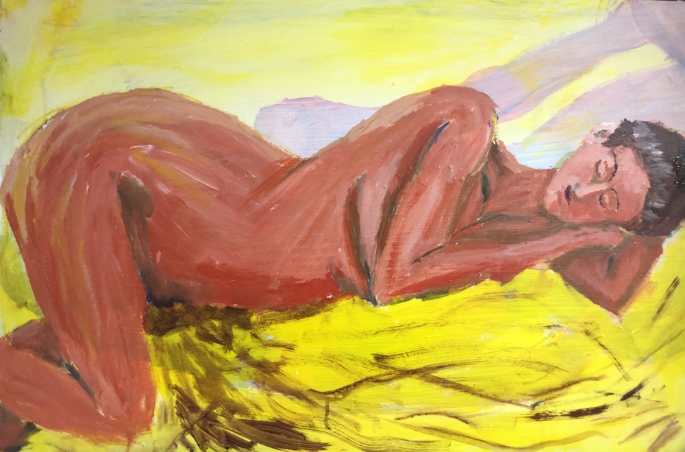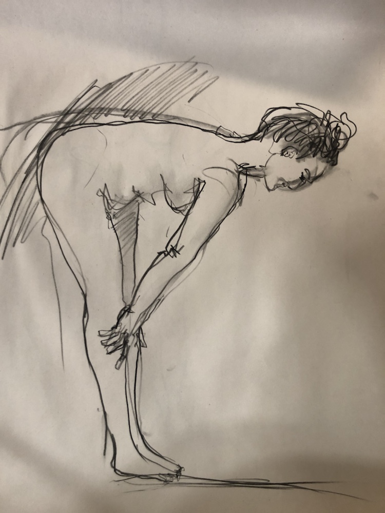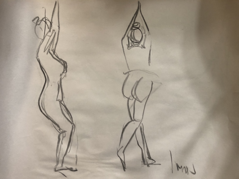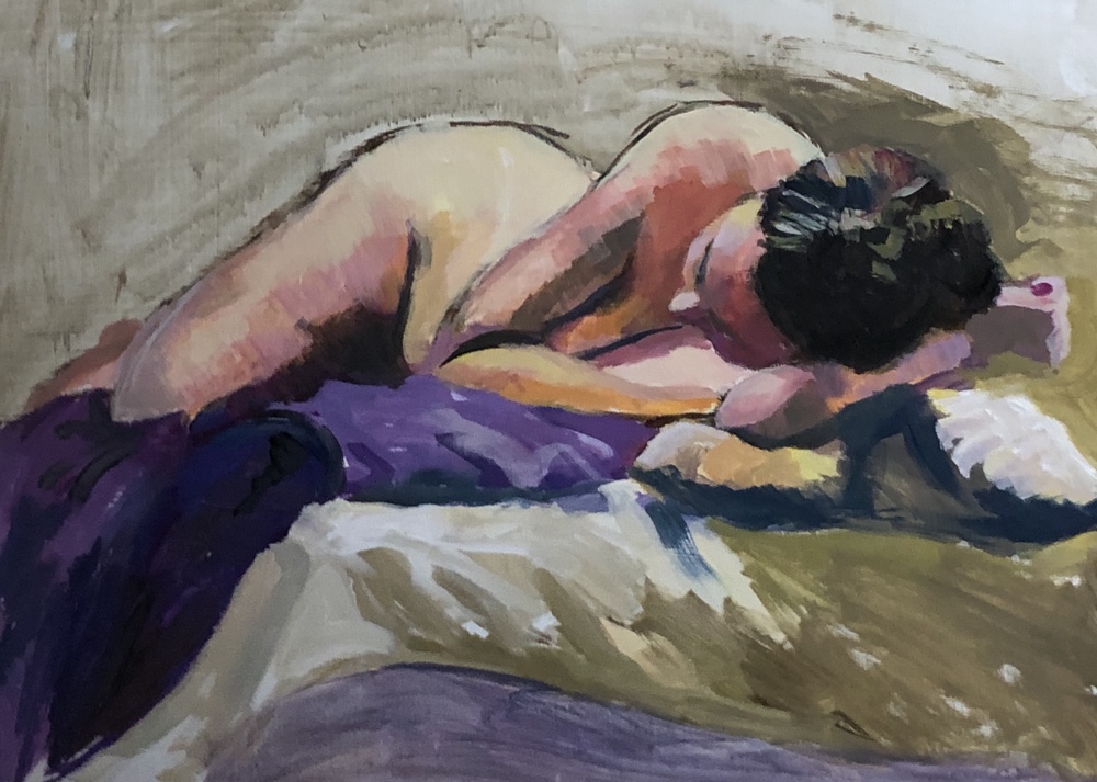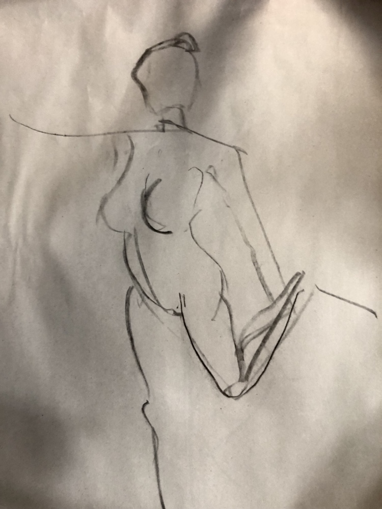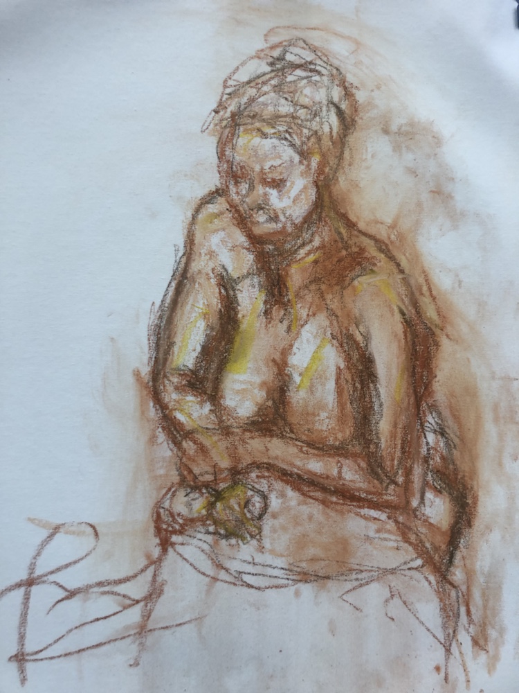 Next break. Or was this when I was done. Not sure. Painted for three 25 min sessions. Since I wasn’t thrilled with the pose I had fun playing and really like all the colors. Lots of alizarin mineral violet Cheap Joes Andrews turquoise. Some cad red and yellow and burnt sienna plus ultramarine.