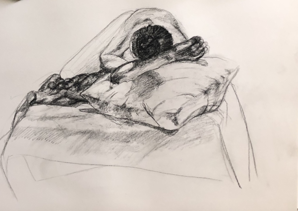 Eves. She and I had fun moaning about Don going to sleep. Really messed with our drawings. Thank goodness I took a pic before he went to sleep.