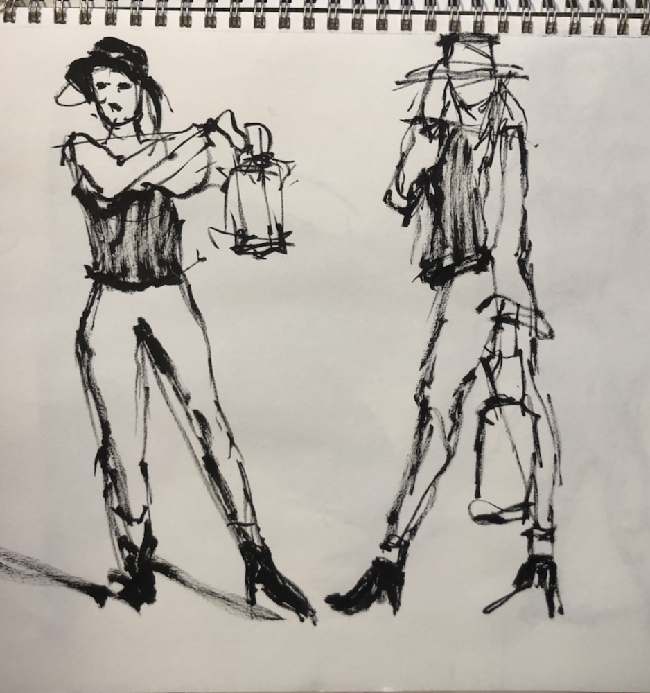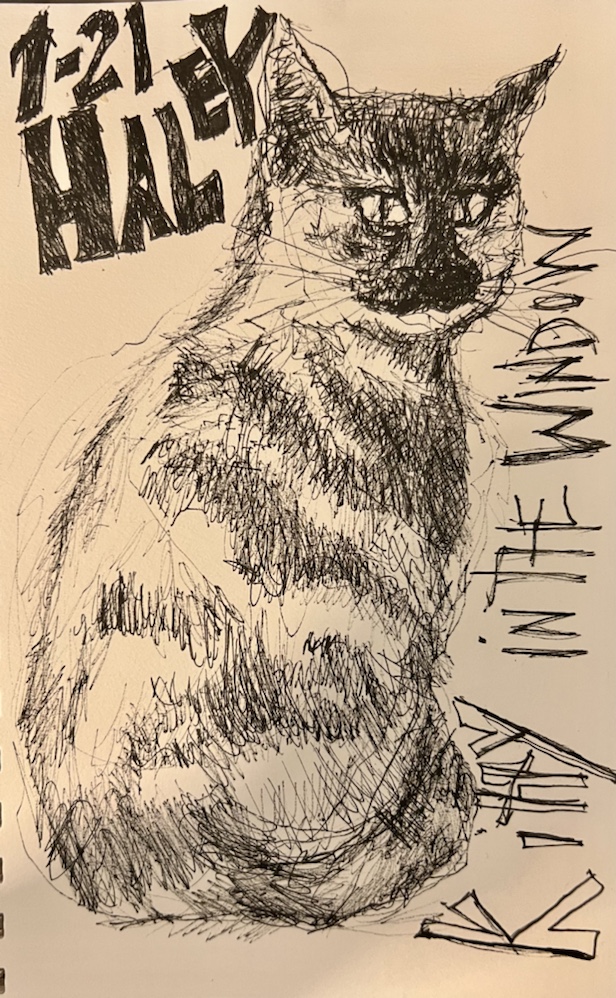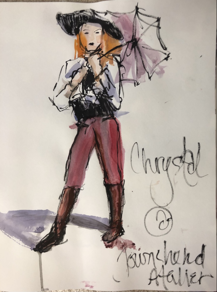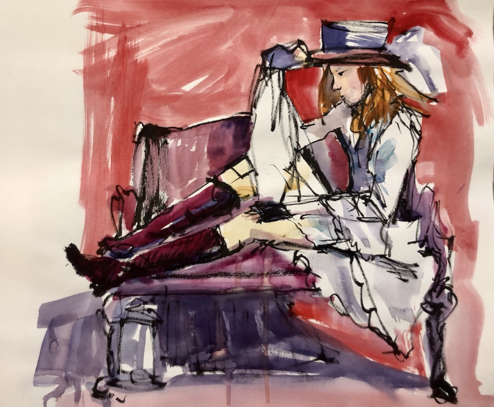 Hair – My chinese brush splatted flat and the dagger brush loaded very light yellow ochre with shadows of burnt sienna and quin burnt orange and cerulean and cobalt probably ultramarine and burnt umber aka anything that seemed to work.
