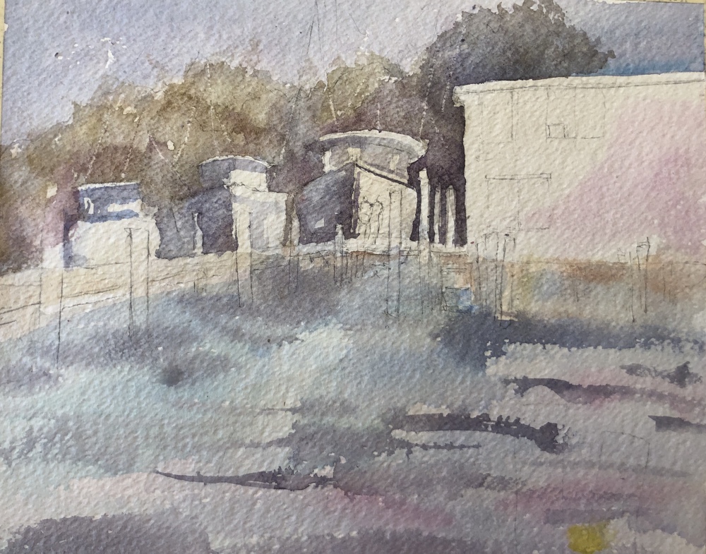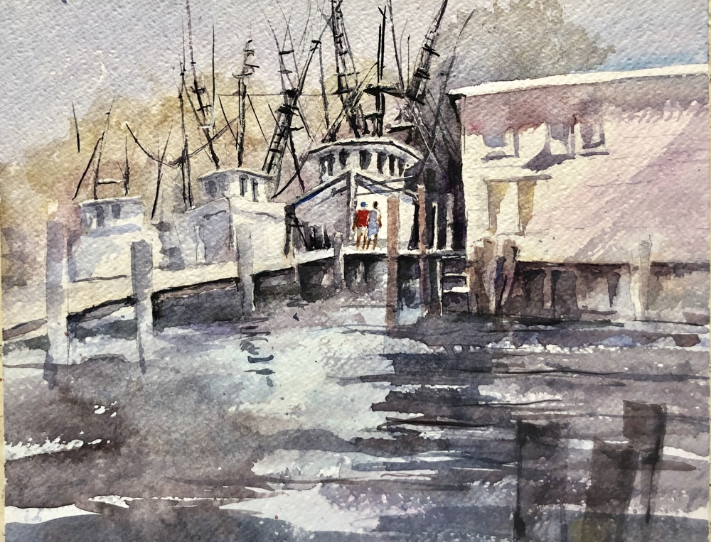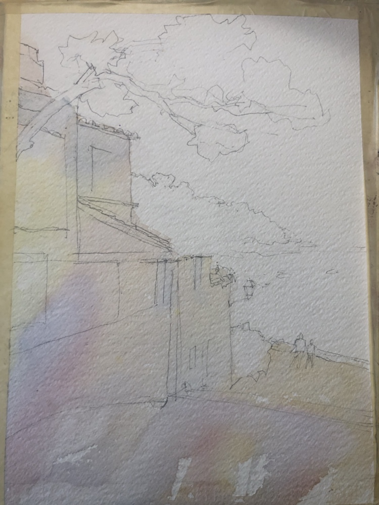 Background aka the water cerulean w a dab of burnt sienna. Multiple washes of Cheap Joes Andrews turquoise w raw sienna or yellow Ochre. I even used a very light lilac. Hmm. Lost some of the light bubbles but oh well.