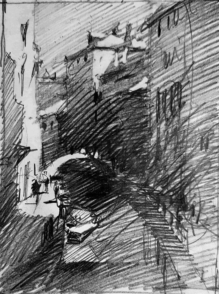 More darks esp foreground and under the umbrellas. The balcony. Playing with my saber brush which us fun to do squiggly calligraphic lines with.