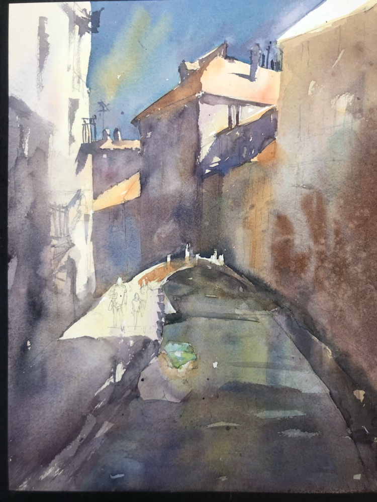 Next knocking out the bridge all the while painting into this wet morass. Burnt sienna and paynes grey.