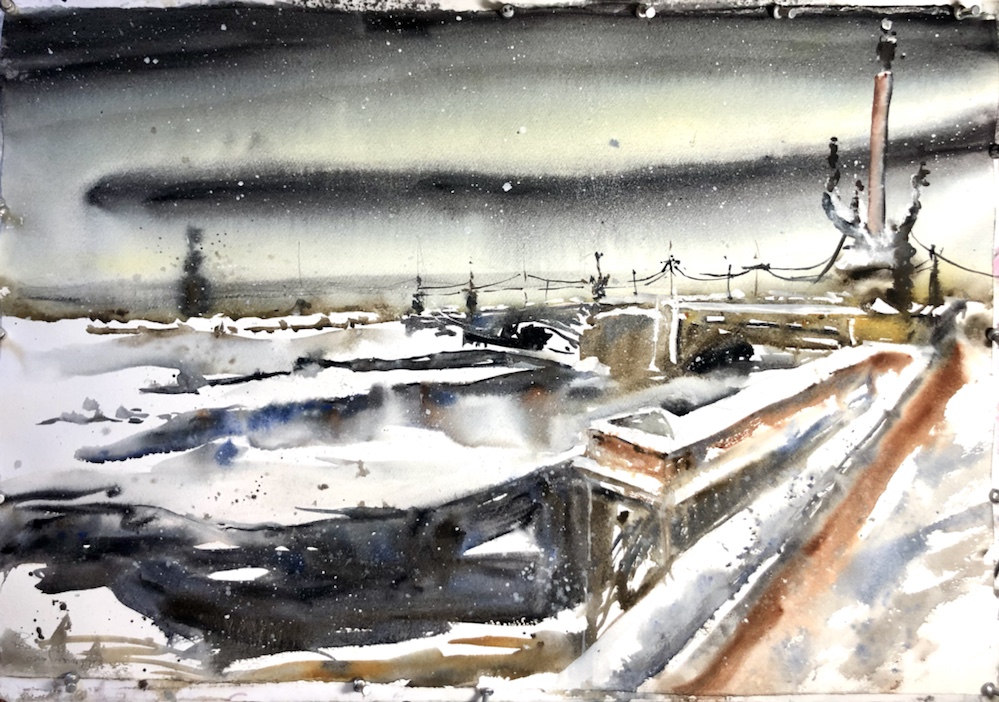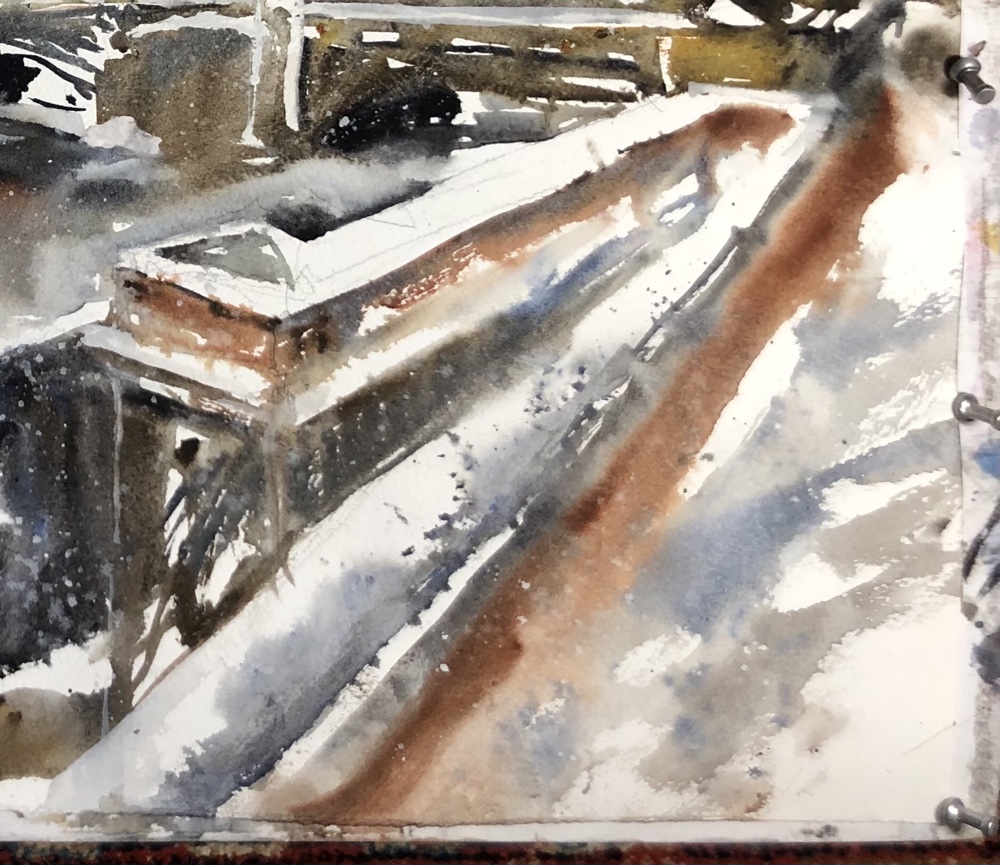 On to the river and the snow. Oops I didn’t draw it so I winged it. A little rewetting of the paper. Very interesting making the light and dark areas, fuzzy and sharp edged.