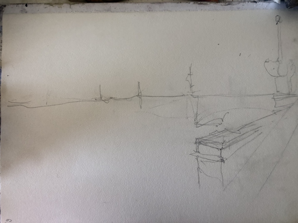 Stage 2. Drawing the boat and environs with a Tombow fine tip end. A number 65 I think.