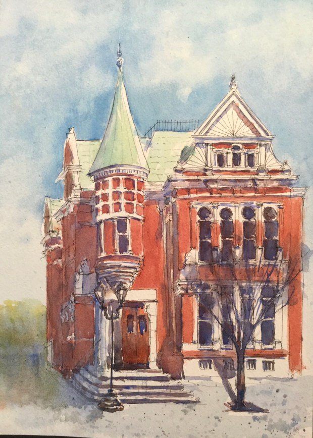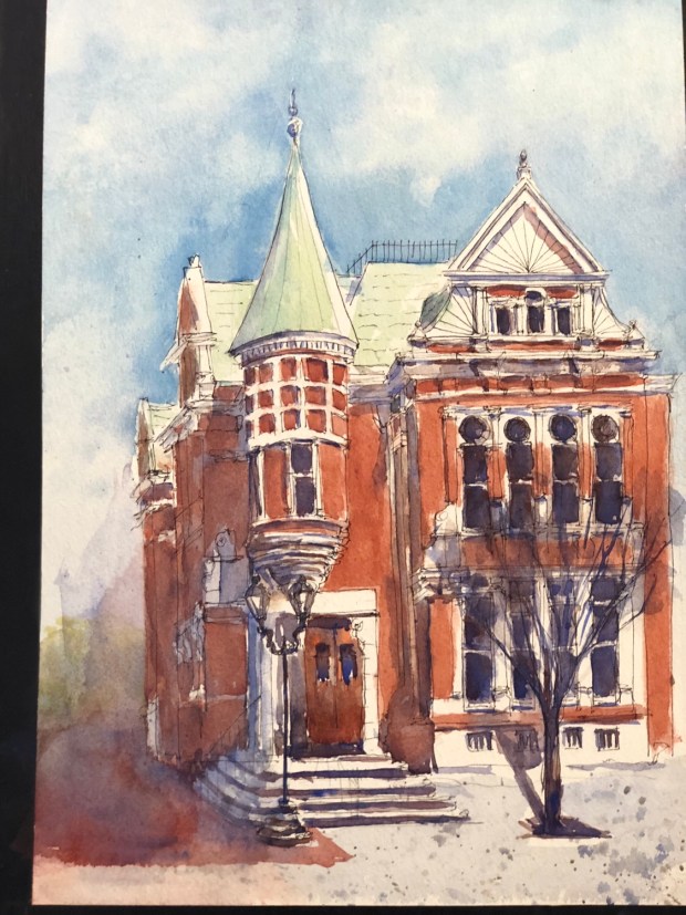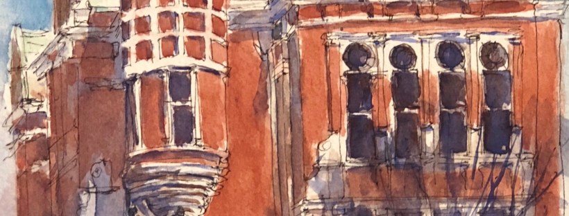 Colors used cobalt blue for shadows and windows w burnt sienna and quin sienna. Building is cad red burnt sienna and alizarin and a touch of cobalt. Roof is DS green from Kim’s class and cerulean. Sky cerulean.
