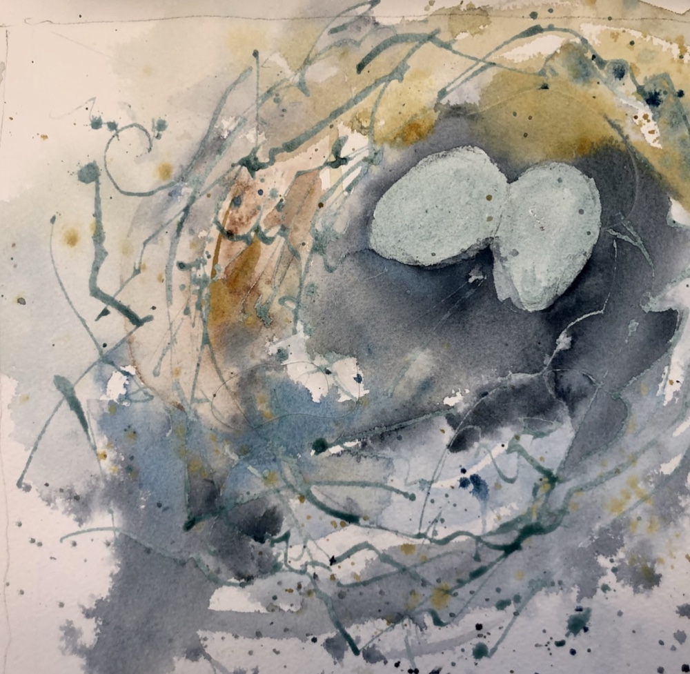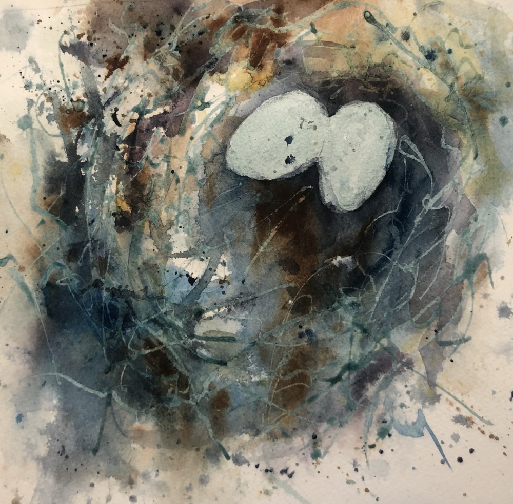 Was just thinking of the diff in these two birds and WHY did i like the heron best? I drew the goose with caran dache and sprayed it to wet the color. I used the watercolor in the background with a big Chinese brush wet on wet with cobalt and indigo. Smack smack and it was done.