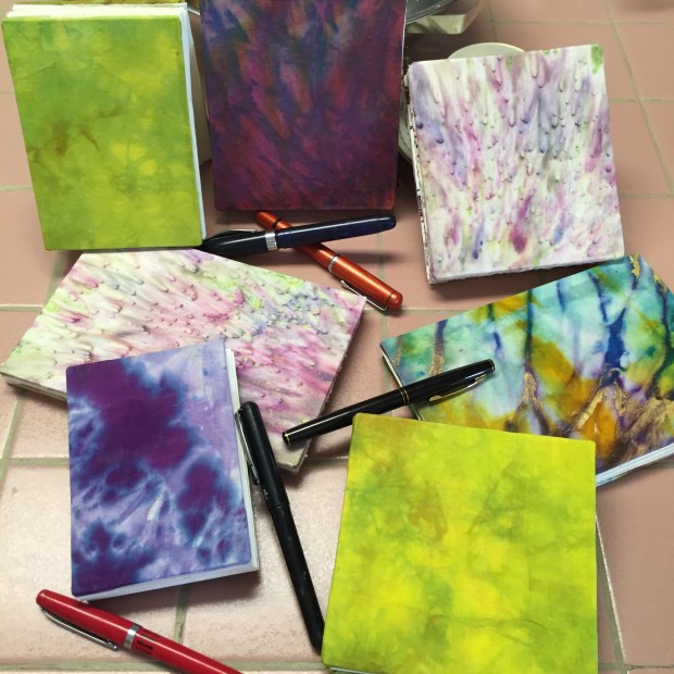 Glue the paper to the covers. (I am not happy with the wrinkly paper. In later books I glued paper over the fabric covered board to make the end papers smoother.