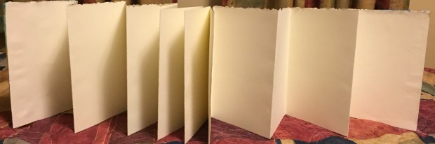 Next fold your strips in half. Crease with the bone folder. Mark your fold lines either every 3 1/2″ or every 5″. Fold like a fan or accordion.