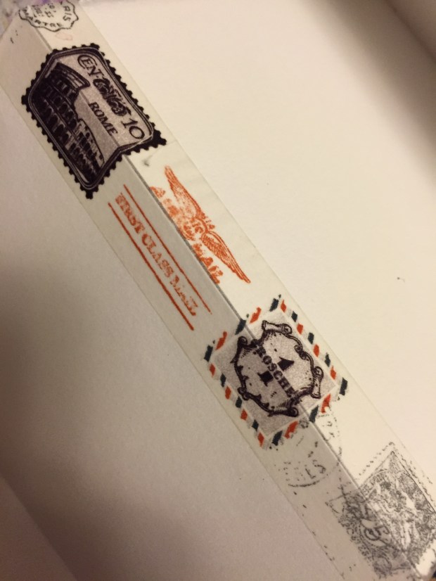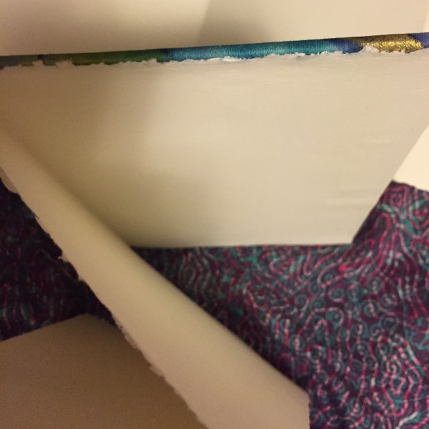 Cut the cardboard covers 1/4″ bigger than your paper strips. Cut your fabric about 2″ bigger than your cardboard pieces.