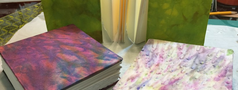 Spread glue on the board evenly. Be sure to cover the whole board. and apply the fabric. Smooth the fabric with your bone folder removing any wrinkles and bubbles in the fabric.