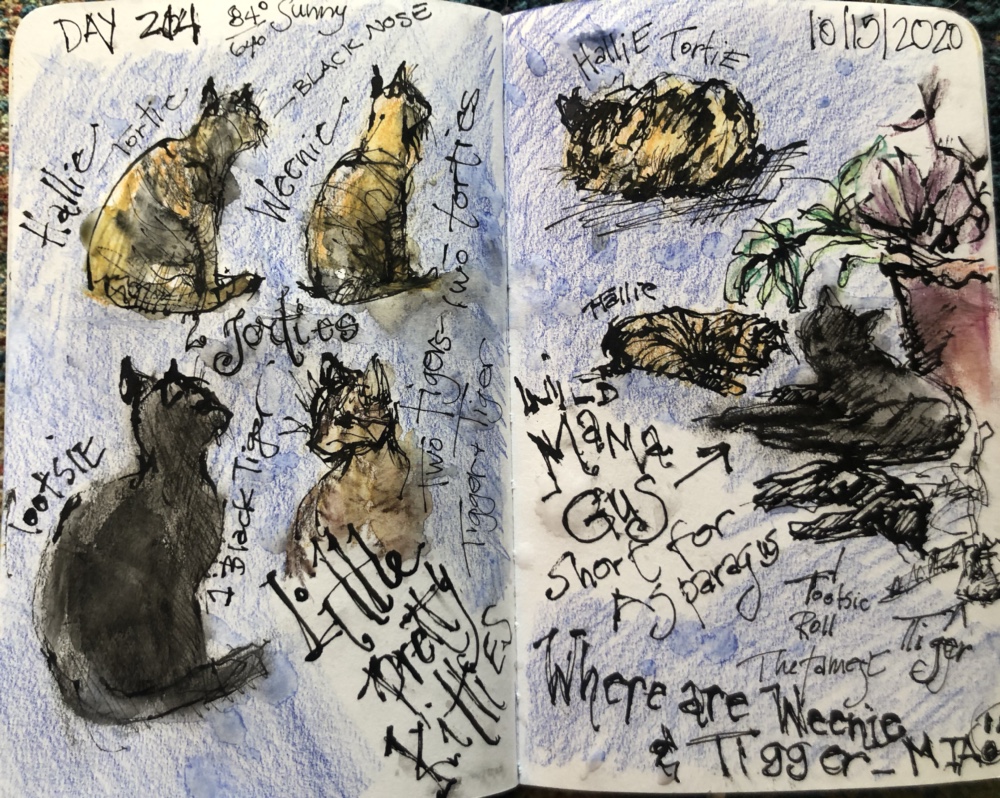 Got bogged down doing paperwork today but managed to draw the pot kitties on my back porch. Oddly once again two are missing. Last time that happened they turned up. So who knows. It’s a wait and see right?!