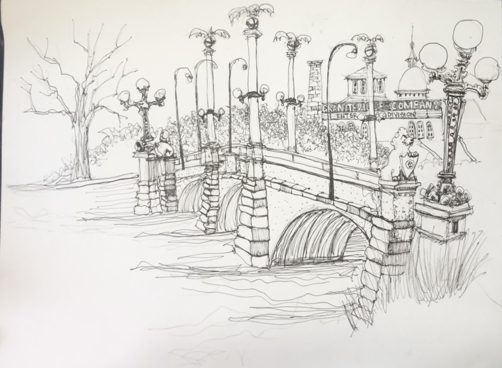 The ink sketch. This stage was not easy for me. Took about 4 hours of thinking and scheming deciding how to draw the bridge.