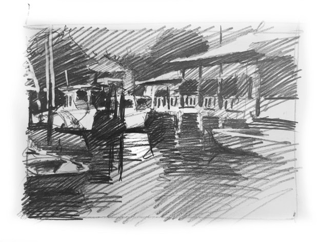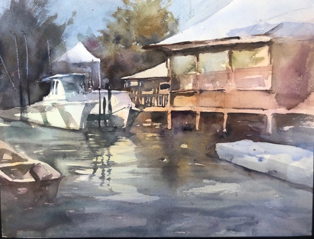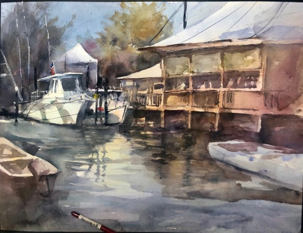 Wires and lines dark darks. People in the restaurant. And there’s that wash I didn’t Finish. That hard line is going to be difficult to fix.