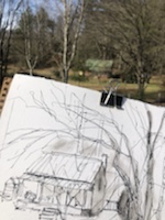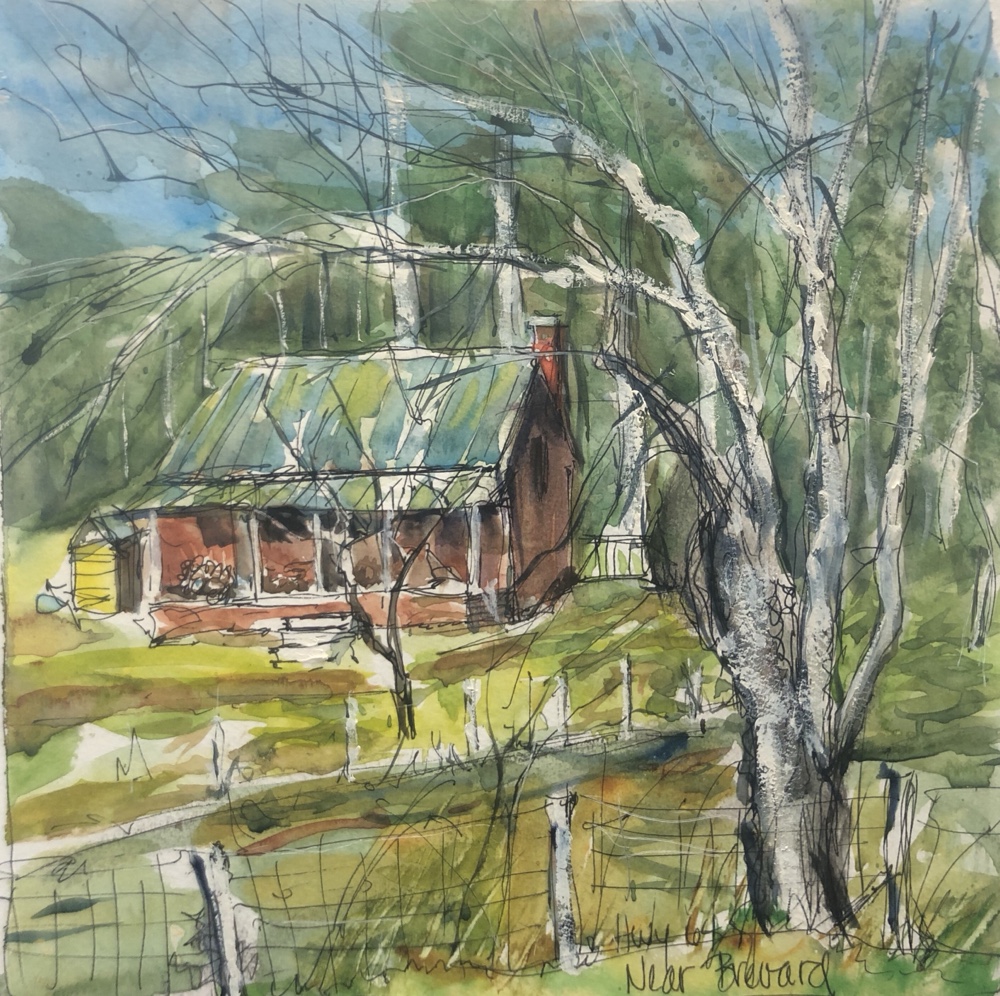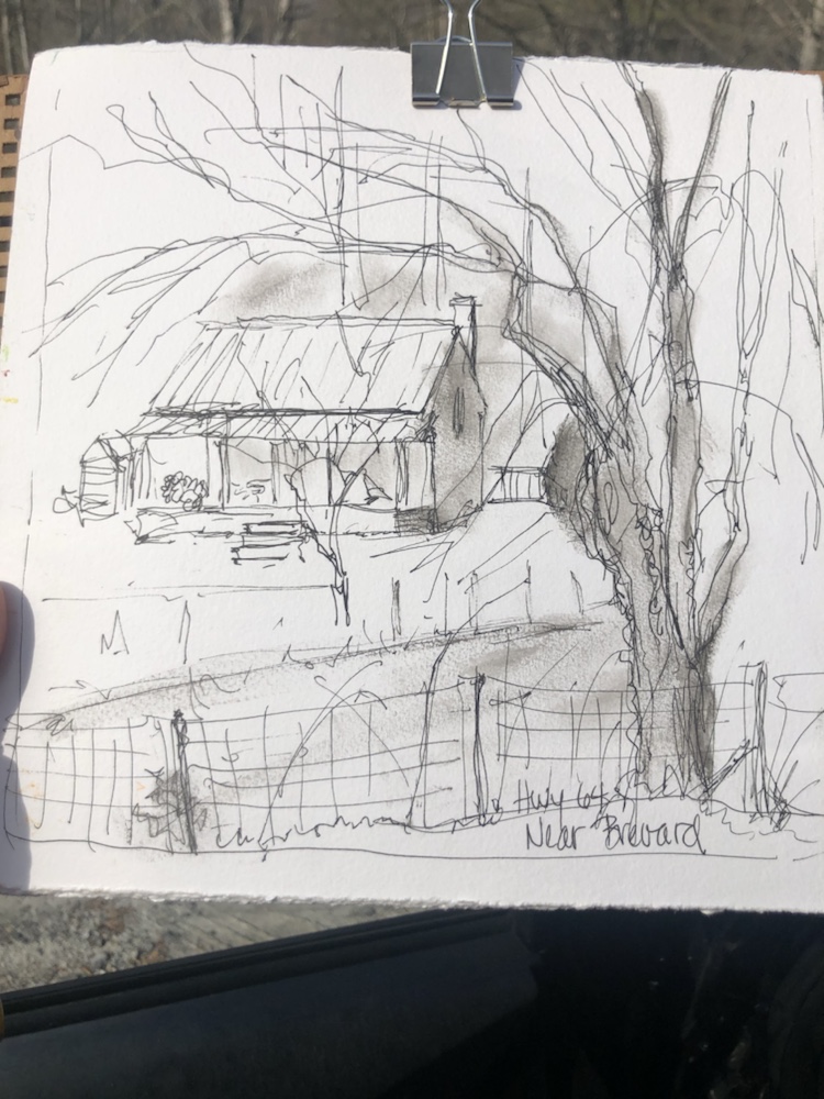 I past this cute cabin on the way into Brevard over the holidays but lazy me just got around to painting the sketch.