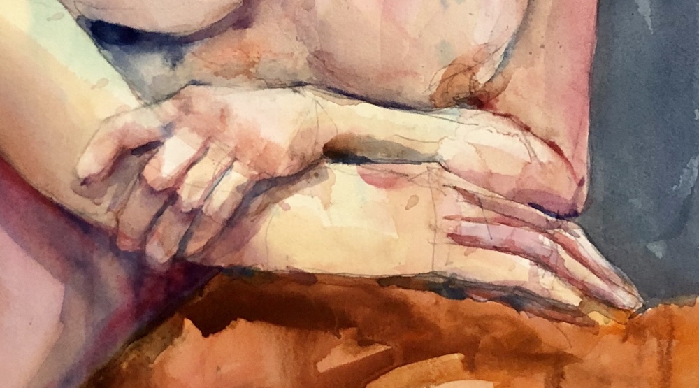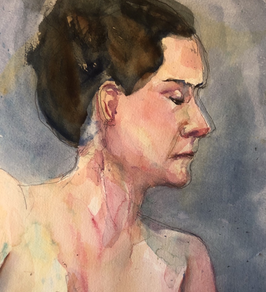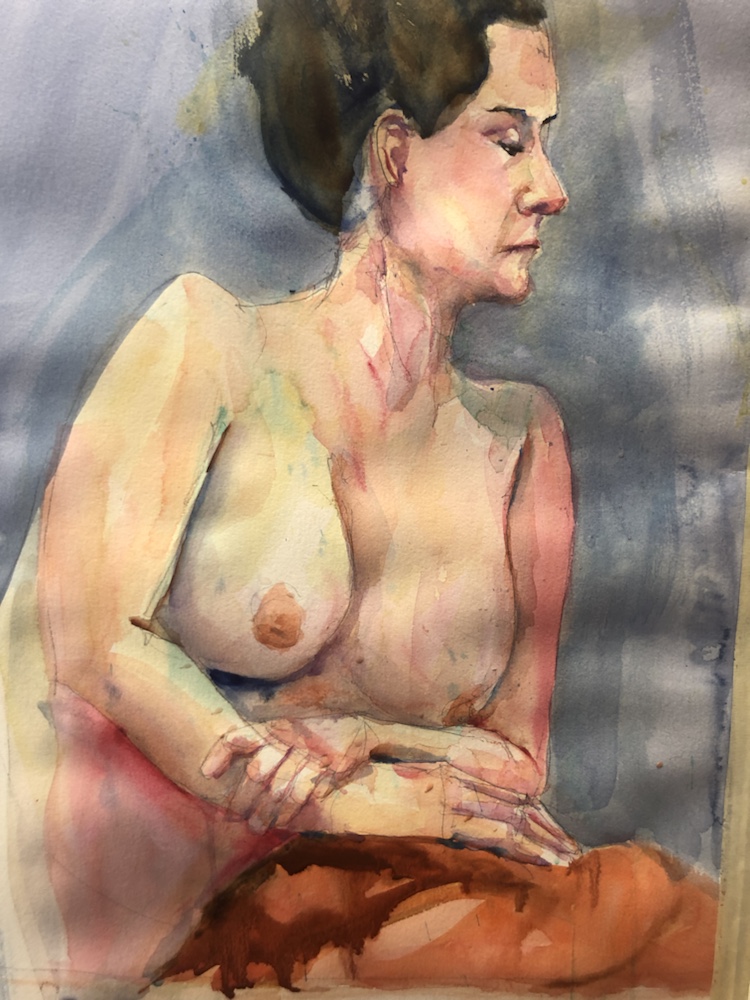 Next break. Or was this when I was done. Not sure. Painted for three 25 min sessions. Since I wasn’t thrilled with the pose I had fun playing and really like all the colors. Lots of alizarin mineral violet Cheap Joes Andrews turquoise. Some cad red and yellow and burnt sienna plus ultramarine.