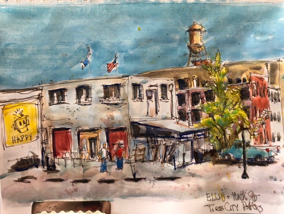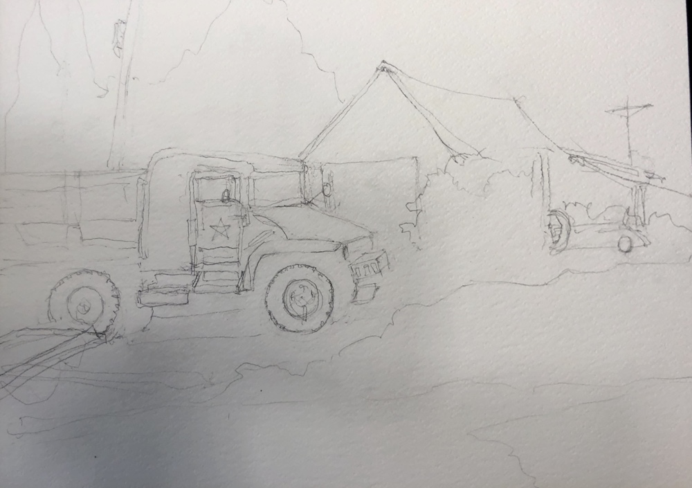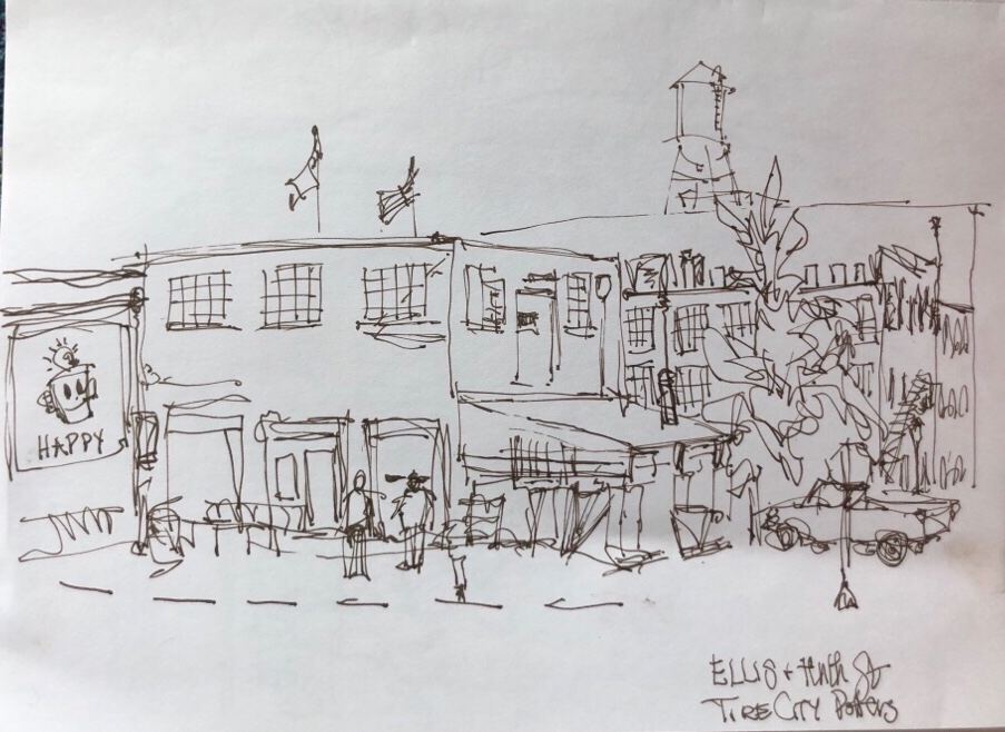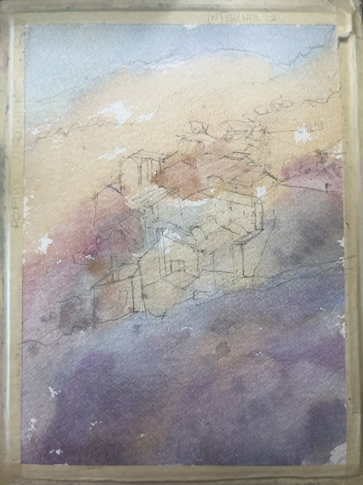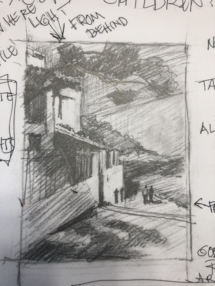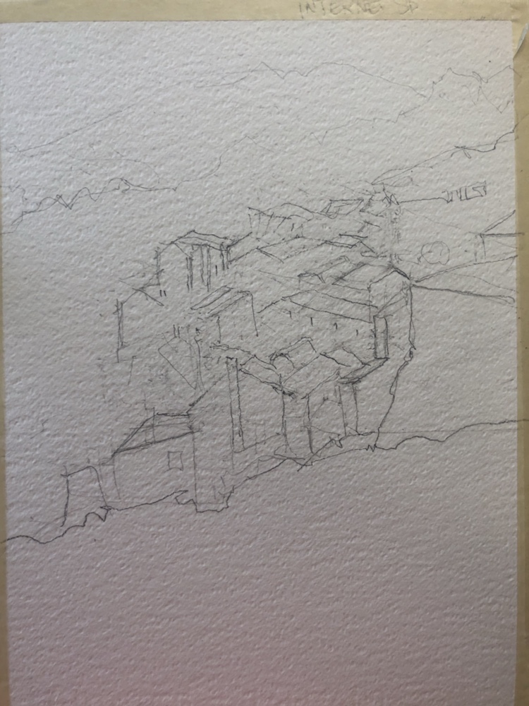 The sketch. I got lost in the roof tops. So many jammed together. Didn’t even draw half the chimneys. Oops