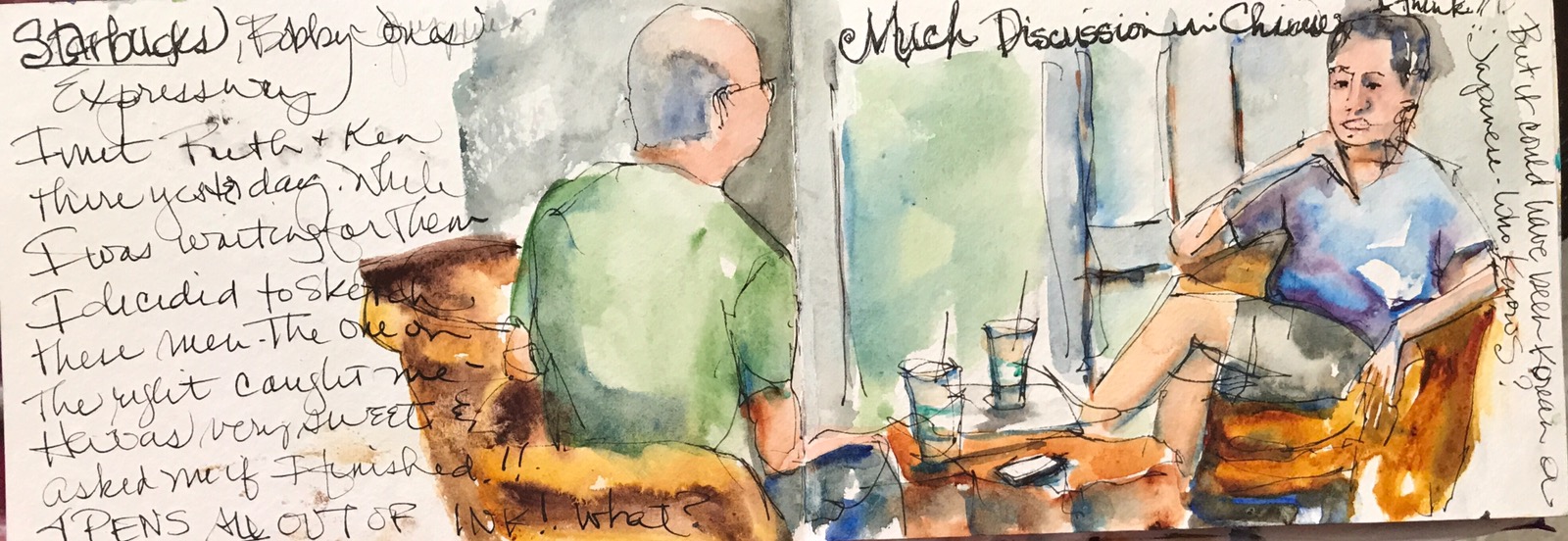 These two guys were just chatting away in Chinese or Korean. Could have been Japanese for all I know. Their conversation was very animated. The guy on the right actually noticed I was drawing. He was really sweet and asked me if I had finished before he left.