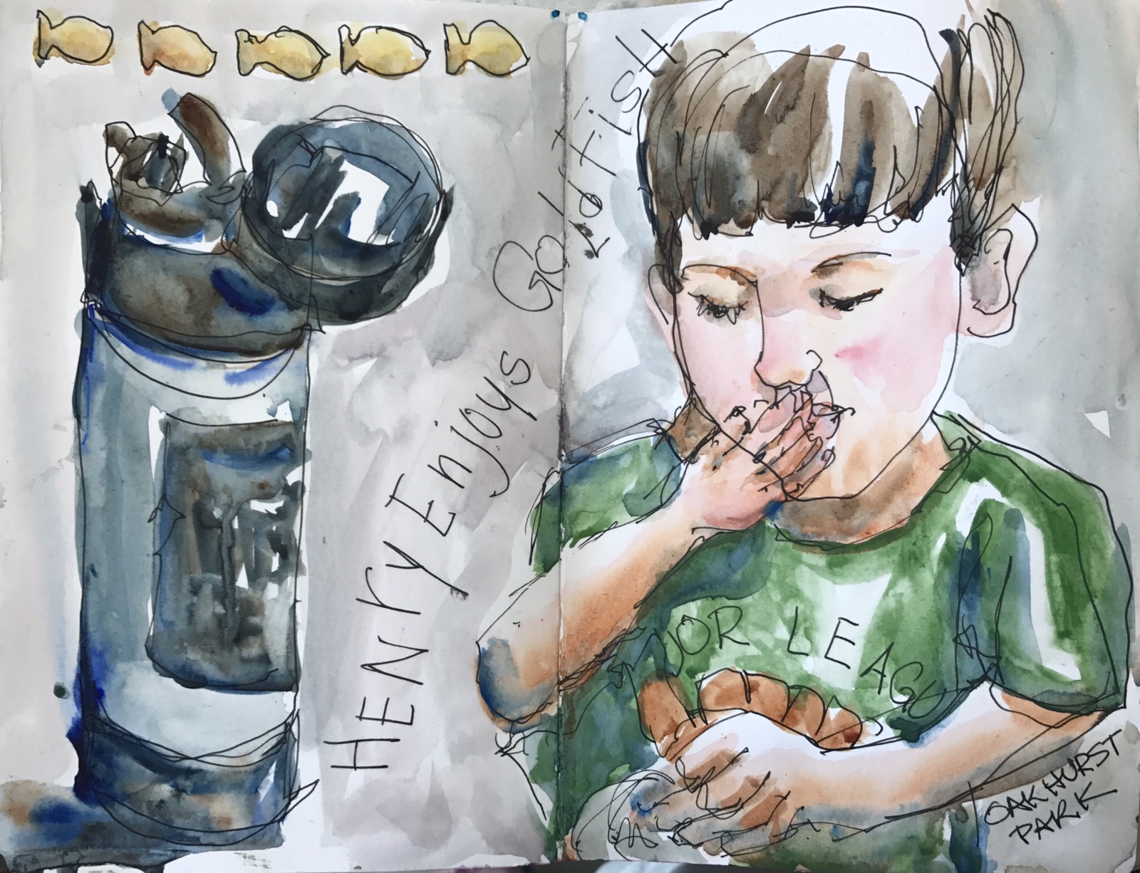 Snacking on goldfish when we went to Oakhurst park. This was a very quick sketch. Have you ever treed drawing a five year old who never stops?! But Henry loved the idea of me drawing him. He tried to hold still. That lasted about a second.