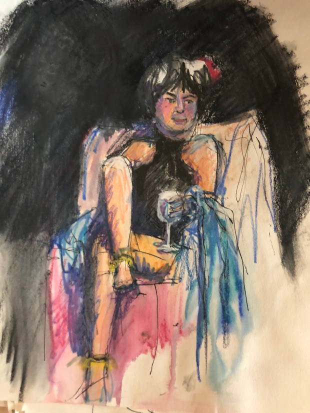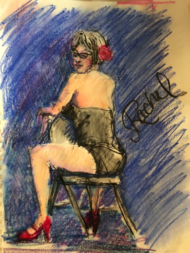 Of our dear friend and fabulous artist Rachel Miller who left this earth Sunday far too early. A sketch of her as our model at Dr Sketchys. Her she is as Marian the librarian. One of the founding members and first director of the Augusta Burlesque group Dirty South.