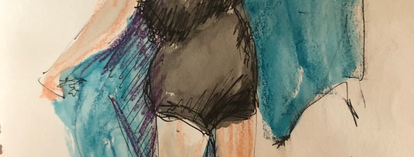 Started off great. A five minute gesture sketch done with a pentel brush pen and watercolor.