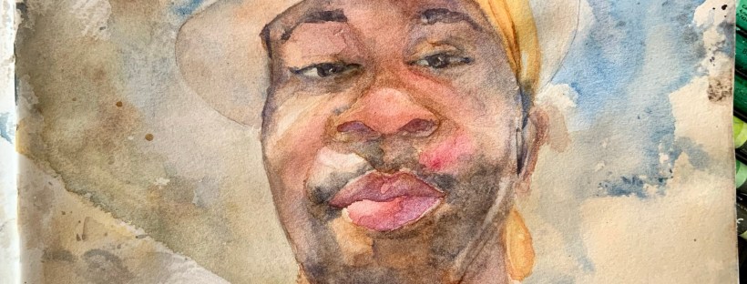 Ultramarine and ivory black for hair and hat. Yellow ochre and cerulean background. Cerulean, andrews turquoise, burnt sienna and ivory black for shirt. Lt cad red feather.