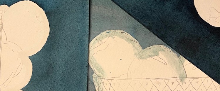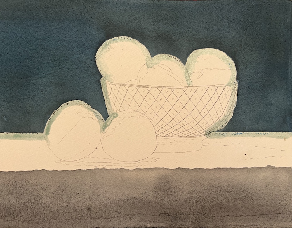 Attempt #3 was best. I kept my lights on most of the apricots. The rock looks good. Background wash might need another layer. Last.