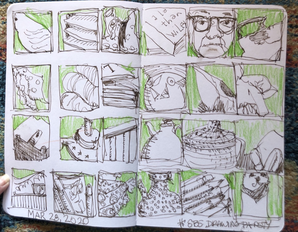 Draw small squares all over your pages and then draw parts of items you can see. Can anyone find Zoe. She’s one of these.