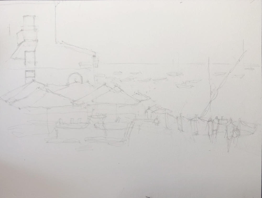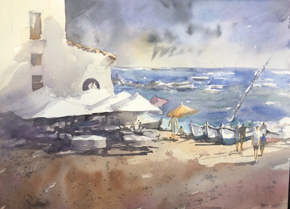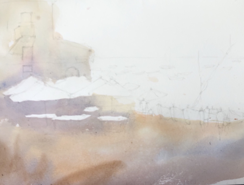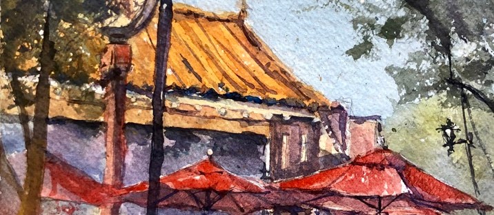 More darks esp foreground and under the umbrellas. The balcony. Playing with my saber brush which us fun to do squiggly calligraphic lines with.