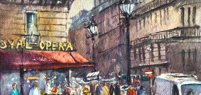 First wash with very watery yellow ochre alizarin crimson cobalt blue and a dab of cobalt teal.