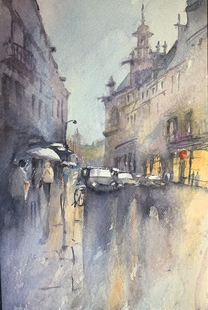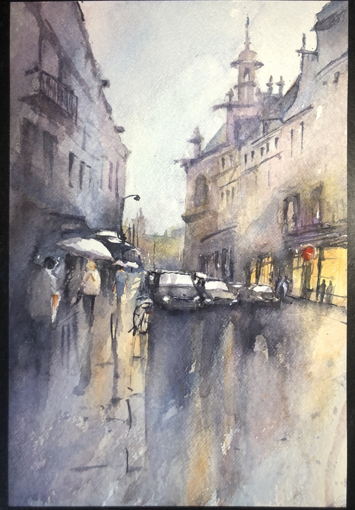 Got this lovely treat Paris in The Rain by Vlad Yesilesev in the mail today. When I looked at it I realized I needed to go a lot darker with my blacks. And whiter w my whites so today I cheated and used masking fluid to reserve some whites.