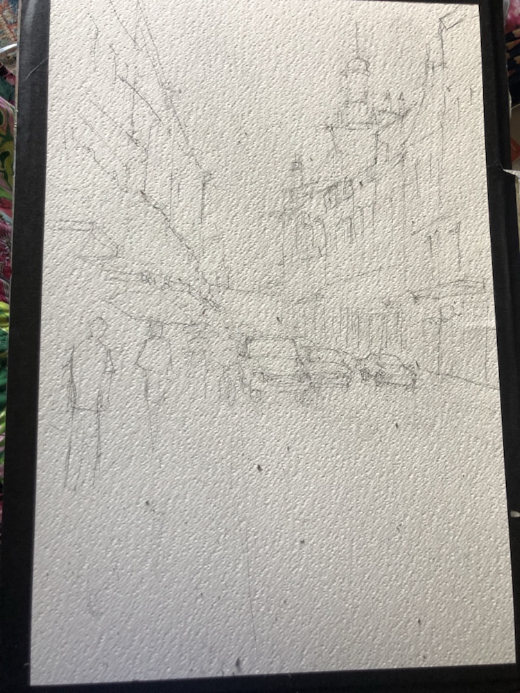 Here’s the sketch. I painted on Arches rough 12×16″ 140 lb. Blaming it for my stripey sky exactly what Vlad said it would do but it was easier to draw on than my rough Fabriano.