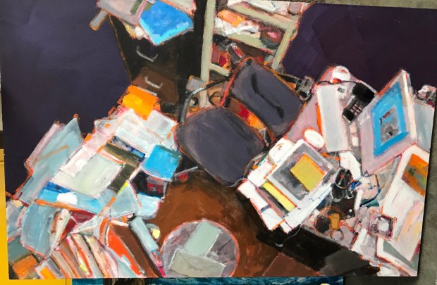 Als office. Always neat. Painted with acrylic. Much wilder than his oil paintings. LOVE This one. Think it got a certificate of merit at the State Fair.