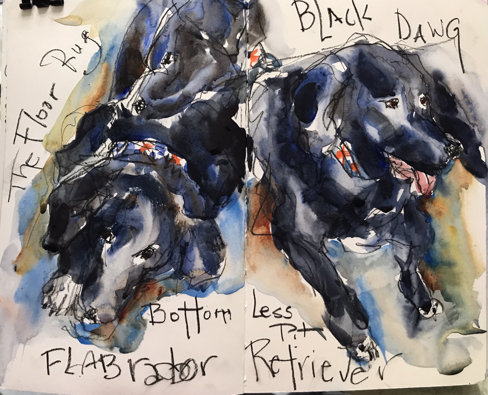 Labs are hard to paint. The highlights are almost blue. I slapped combos of mixed burnt umber and ultramarine in the dark areas and bled out the edges w clean water for the highlights. Shadows are cerulean and Quin burnt sienna.