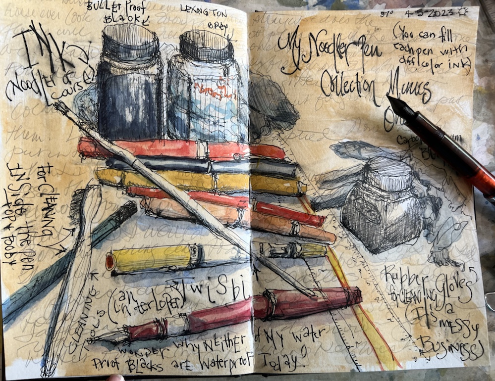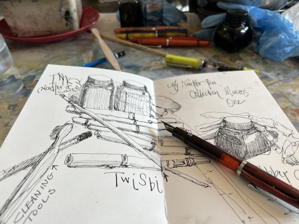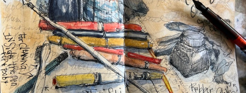 The Messy Table i have been letting pile up in the den. Lamy EF, watercolor and inktense pencils and tombow markers and Strathmore mixed media sketchbook which used to be my go to sketchbook til i found Stillman and Birn. The paper is much heavier than the S and B alpha i normally use. 140 # cpColoredI painted the wc pencil with my winsor newton momarch psuedo mongoose 1/2β flat love the way it painted.