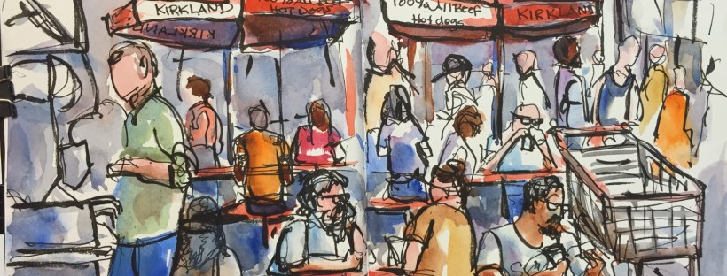 Last week I sat in the corner at Costco’ s cafe area drawing the lunch crowd. There’s one table that has a 180 view and SCORE. I hid behind my purse.
